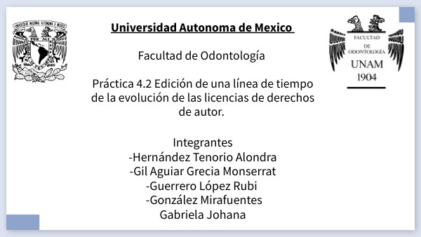 Universidad Autonoma de Mexico Facultad de Odontología Práctica 4.2 Edición de una línea de tiempo de la evolución de las licencias de derechos de autor.