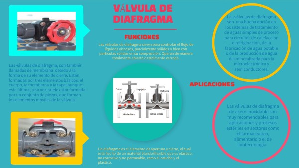 Las válvulas de diafragma sirven para controlar el flujo de líquidos viscosos, parcialmente sólidos o bien con partículas sólidas en su composición. Operan de manera totalmente abierta o totalmente cerrada.