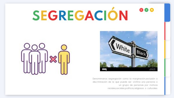 Denomimanos segregación como la marginación,exclusión o discriminación de la que puede ser víctima una persona o un grupo de personas por motivos raciales,sociales,políticos,religiosos o culturales.