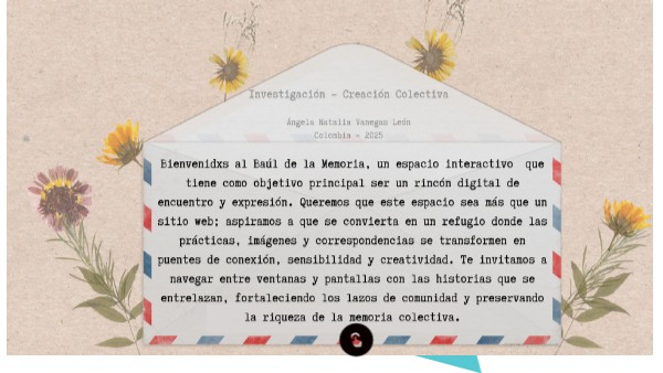 Este espacio atesora cada una de las 30 Correspondencias que hacen parte del capítulo N°11 "Memorias dentro del Baúl: Entre lo digital y lo análogo" Ventana 11.1."Memorias Rveladas" Son reflexiones que hacen parte de la metodología de este proceso, resultado de los laboratorios y encuentros realizados con las mujeres de los Colectivos Madres de los Falsos Positivos de Soacha - MAFAPO Y Mujeres Caminando por la verdad y la justicia - MCV de la Comuna 13 en Medellín. Reúne Narrativas entrelazadas, que dan cuenta del proceso de indagación, creación y hallazgos, en el marco de las prácticas de resistencia de estas comunidades.