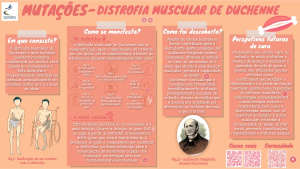 Esta mutação genética no cromossoma X é uma deleção. Ocorre a deleção do gene DMD, ou seja, a perda de material cromossómico deste gene, que leva à sua ausência. A presença do gene é responsável por codificar a distrofina, proteína essencial para a manutenção da membrana celular dos músculos, encarregue pelo bom funcionamento dos mesmos.