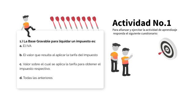 1.) La Base Gravable para liquidar un impuesto es:a. El IVA b. El valor que resulta al aplicar la tarifa del Impuesto c. Valor sobre el cual se aplica la tarifa para obtener el impuesto respectivo. d. Todas las anteriores