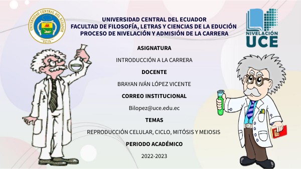 ASIGNATURA INTRODUCCIÓN A LA CARRERA DOCENTE BRAYAN IVÁN LÓPEZ VICENTE CORREO INSTITUCIONAL Bilopez@uce.edu.ec TEMAS REPRODUCCIÓN CELULAR, CICLO, MITÓSIS Y MEIOSIS PERIODO ACADÉMICO 2022-2023