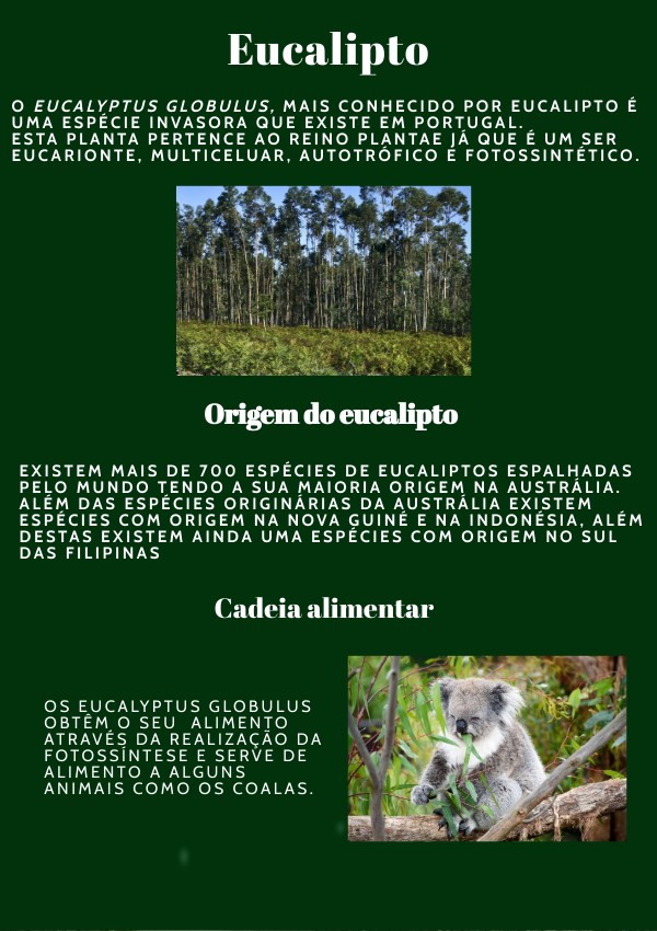 O eucalyptus globulus, mais conhecido por eucalipto é uma espécie invasora que existe em Portugal.Esta planta pertence ao reino plantae já que é um ser eucarionte, multiceluar, autotrófico e fotossintético.