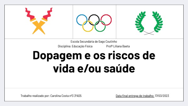Neste trabalho abordei o tema do doping e os seus riscos para a saúde. Após a realização deste , pude concluir que de facto, o doping é um problema bastante atual com graves consequências. Este trabalho foi muito importante para o meu conhecimento deste tema , além de me ter permitido aperfeiçoar competências de investigação, seleção e organização. Webgrafia https://view.genial.ly/6030199403ef0d0daa3ab6d9/presentation-dopingjulia11i10 https://thumbs.jusbr.com/imgs.jusbrasil.com/publications/noticias/images/doping-71469813423.jpg https://www.sicad.pt/PT/Cidadao/Tu-alinhas/PelaTuaSaude/Paginas/detalhe.aspx?itemId=3&lista=Doenca&bkUrl=/BK/Cidadao/Tu-alinhas/PelaTuaSaude