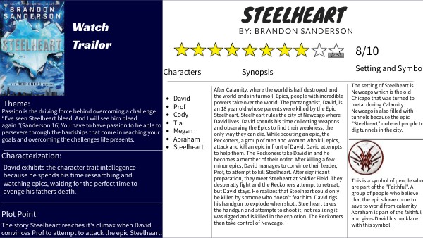 After Calamity, where the world is half destroyed and the world ends in turmoil, Epics, people with incredible powers take over the world. The protanganist, David, is an 18 year old whose parents were killed by the Epic Steelheart. Steelheart rules the city of Newcago where David lives. David spends his time collecting weapons and observing the Epics to find their weakness, the only way they can die. While scouting an epic, the Reckoners, a group of men and women who kill epics, attack and kill an epic in front of David. David attempts to help them. The Reckoners take David in and he becomes a member of their order. After killing a few minor epics, David manages to convince their leader, Prof, to attempt to kill Steelheart. After significant preparation, they meet Steeheart at Soldier Field. They desperatly fight and the Reckoners attempt to retreat, but David stays. He realizes that Steelheart could only be killed by somone who doesn't fear him. David rigs his handgun to explode when shot . Steelheart takes the handgun and attempts to shoot it, not realizing it was rigged and is killed in the explotion. The Reckoners then take control of Newcago.