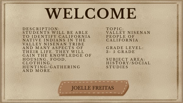 Description: Students will be able to identify California Native Indians in the Valley Nisenan Tribe and many aspects of their life. They will gain the knowledge of housing, food, clothing, hunting/gathering and more.