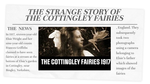 In 1917, sixteen-year-old Elsie Wright and her nine-year-old cousin Frances Griffiths claimed to have seen fairies at a stream at the bottom of Elsie's garden in Cottingley, near Bingley, Yorkshire,