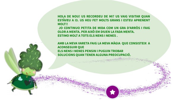 HOLA DE NOU! US RECORDEU DE MI? US VAIG VISITAR QUAN ESTÀVEU A I3. US HEU FET MOLTS GRANS I ESTEU APRENENT MOLT!! JO CONTINUO PETITA DE MIDA COM UN GRA D'ARRÒS I FAIG OLOR A MENTA. PER AIXÒ EM DIUEN LA FADA MENTA. ESTIMO MOLT A TOTS ELS NENS I NENES . AMB LA MEVA VARETA FAIG LA MEVA MÀGIA QUE CONSISTEIX A ACONSEGUIR QUE ELS NENS I NENES PENSIN I PUGUIN TROBAR SOLUCIONS QUAN TENEN ALGUNA PREOCUPACIÓ.