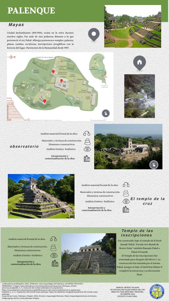 colaboradores de Wikipedia. (2023, 28 febrero). Zona arqueológica de Palenque. LOS MAYAS: PALACIOS Y PIRAMIDES(s. f.).https://www.almendron.com/arte/arquitectura/mayas/may_04/mayas_04.htm johannacarvajal2095. (s. f.). Evolución del control ambiental en la arquitectura. https://www.slideshare.net/johannacarvajal2095/evolucin-del-control-ambiental-en-la-arquitectura Gastelum, C. (s. f.). Arquitectura del mundo maya: palenque. https://es.slideshare.net/gasib/arquitectura-del-mundo-maya-palenque Grupo de las Cruces, Palenque, Chiapas. (2016, 25 junio). Arqueología Mexicana. https://arqueologiamexicana.mx/mexico-antiguo/grupo-de-las-cruces-palenque-chiapas