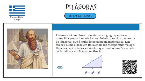Pitágoras foi um filósofo e matemático grego que nasceu numa ilha grega chamada Samos. Foi ele que criou o teorema de Pitágoras, que é muito importante na matemática. Este faleceu numa cidade em Itália chamada Metapontum Village.Uma das curiosidades sobre ele é que fundou uma Sociedade de Estudiosos em Magna, na Grécia.