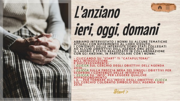 Abbiamo intervistato i nonni su alcune tematiche attuali con riferimento al loro vissuto.i contenuti delle interviste sono stati collegati ad alcuni obbiettivi dell'agenda Onu 2030. il lavoro è stato realizzato in collaborazione con gli anziani, in particolare con i nonni. - cliccando su "start" ti "catapulterai" nell'introduzione... e successivamente: - clicca sul cerchio degli obiettivi dell'agenda 2030... - clicca sulla freccia nera dei singoli obiettivi per scoprire i contenuti delle interviste - clicca su "info" per leggere qualche approfondimento - e... per tornare all'indice degli obiettivi clicca sul cerchio colorato simbolo dell'agenda onu 2030