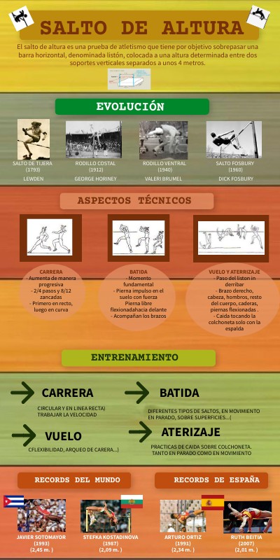 El salto de altura es una prueba de atletismo que tiene por objetivo sobrepasar una barra horizontal, denominada listón, colocada a una altura determinada entre dos soportes verticales separados a unos 4 metros.