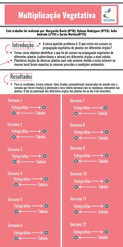 - Para os resultados, iremos colocar: fotos tiradas semanalmente (numeradas de acordo com a semana que foram tiradas) à plantação e uma tabela semanal com os mudanças relevantes nas plantas. O dia da plantação dos diferentes órgãos das plantas foi no dia 4 de novembro.