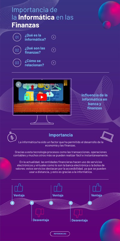 La informática ha sido un factor que ha permitido el desarrollo de la economía y las finanzas. Gracias a esta tecnología procesos como las transacciones, operaciones contables y muchos otros más se pueden realizar fácil e instantáneamente. En la actualidad, las entidades financieras hacen uso de servicios electrónicos y virtuales como lo son la banca electrónica o la bolsa de valores; estos servicios destacan por la accesibilidad, ya que se pueden usar a distancia, y esto es gracias a la informática.