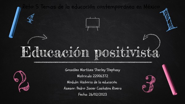 En esta presentación estaremos analizando en primer lugar que es el positivismo ,como nació esta propuesta, quien fue su fundador y porque considero de importancia la implantación de dicha propuesta educativa: además estaremos analizando algunas de las características y principios más importantes de esta, en conjunto de sus ventajas y desventajas, también estaremos viendo cuales eran las etapas y como se llevaban a cabo cada una de ellas. También veremos como es que a tenido un impacto en la educación en México y en la educación actual..
