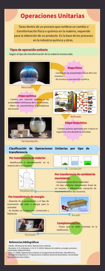 - Lifeder. (28 de junio de 2021). Operaciones unitarias. - Monsalvo, V. R., & Romero, S. M. D. R. (2014). Balance de materia y energía: procesos industriales, Editorial Patria. - Ibarz, A. (2008). Operaciones unitarias en la ingeniería de alimentos. MundiPrensa. - De Ingenierı́a Quı́mica, E. P. Operaciones Unitarias (Doctoral dissertation, Universidad Nacional Pedro Ruiz Gallo).