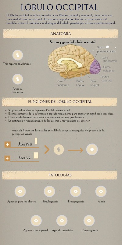 El lóbulo occipital se ubica posterior a los lóbulos parietal y temporal, tiene tanto una cara medial como una lateral. Ocupa una pequeña porción de la parte trasera del encéfalo, entre el cerebelo y se distingue del lóbulo parietal por el surco parietooccipital.