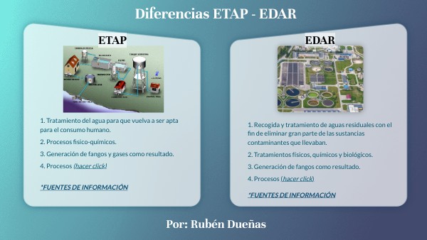 - https://www.miteco.gob.es/es/agua/temas/saneamiento-depuracion/sistemas/edar/default.aspx - https://www.iagua.es/respuestas/que-es-etap - https://www.canaldeisabelsegunda.es/estatico/ciclodelagua/index.html#p/tratamiento - https://www.iagua.es/respuestas/estacion-depuradora-aguas-residuales