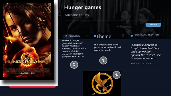 "Katniss everdeen is tough, inpendent,fiery and she will fight against the district. she is very independent