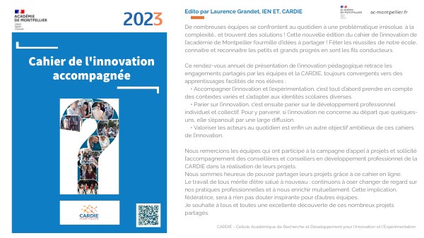 Edito par Laurence Grandet, IEN ET, CARDIE De nombreuses équipes se confrontent au quotidien à une problématique irrésolue, à la complexité… et trouvent des solutions ! Cette nouvelle édition du cahier de l’innovation de l’académie de Montpellier fourmille d’idées à partager ! Fêter les réussites de notre école, connaitre et reconnaitre les petits et grands progrès en sont les fils conducteurs. Ce rendez-vous annuel de présentation de l’innovation pédagogique retrace les engagements partagés par les équipes et la CARDIE, toujours convergents vers des apprentissages facilités de nos élèves : • Accompagner l’innovation et l’expérimentation, c’est tout d’abord prendre en compte des contextes variés et s’adapter aux identités scolaires diverses. • Parier sur l’innovation, c’est ensuite parier sur le développement professionnel individuel et collectif. Pour y parvenir, si l’innovation ne concerne au départ que quelques-uns, elle s’épanouit par une large diffusion. • Valoriser les acteurs au quotidien est enfin un autre objectif ambitieux de ces cahiers de l’innovation. Nous remercions les équipes qui ont participé à la campagne d’appel à projets et sollicité l’accompagnement des conseillères et conseillers en développement professionnel de la CARDIE dans la réalisation de leurs projets.Nous sommes heureux de pouvoir partager leurs projets grâce à ce cahier en ligne.Le travail de tous mérite d’être salué à nouveau ; continuons à oser changer de regard sur nos pratiques professionnelles et à nous enrichir mutuellement. Cette implication, fédératrice, sera à n’en pas douter inspirante pour d’autres équipes. Je souhaite à tous et toutes une excellente découverte de ces nombreux projets partagés.