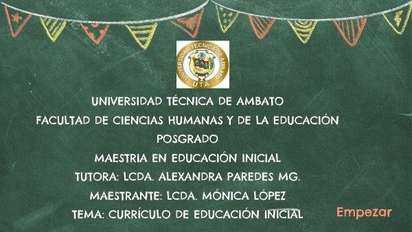 UNIVERSIDAD TÉCNICA DE AMBATO FACULTAD DE CIENCIAS HUMANAS Y DE LA EDUCACIÓN POSGRADO MAESTRIA EN EDUCACIÓN INICIAL TUTORA: LCDA. ALEXANDRA PAREDES MG. MAESTRANTE: Lcda. MÓNICA LÓPEZ TEMA: CURRÍCULO DE EDUCACIÓN INICIAL
