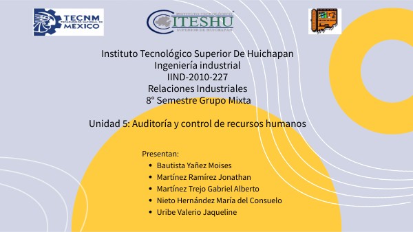 Instituto Tecnológico Superior De Huichapan Ingeniería industrial IIND-2010-227 Relaciones Industriales 8° Semestre Grupo Mixta Unidad 5: Auditoría y control de recursos humanos