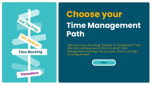 Not sure if you are a Frog, Tomato, or Timeblocker? Take this short pathway quiz to find out which Time Management Technique fits you best. There is no right or wrong answer!