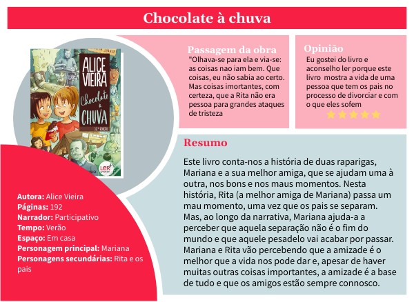 Autora: Alice VieiraPáginas: 192 Narrador: Participativo Tempo: Verão Espaço: Em casa Personagem principal: Mariana Personagens secundárias: Rita e os pais