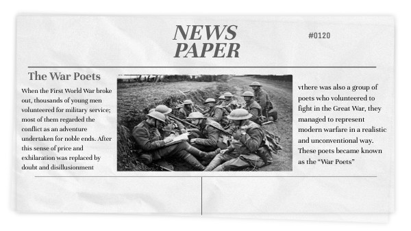 vthere was also a group of poets who volunteered to fight in the Great War, they managed to represent modern warfare in a realistic and unconventional way. These poets became known as the “War Poets”