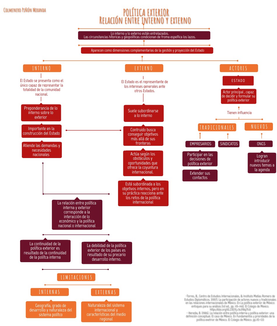 :-Torres, B., Centro de Estudios Internacionales, & Instituto Matías Romero de Estudios Diplomáticos. (1997). La participación de actores nuevos y tradicionales en las relaciones internacionales de México. En La política exterior de México: enfoques para su análisis (1st ed., pp. 119–146). El Colegio de Mexico. https://doi.org/10.2307/j.ctv3f8q79.8 - Heredia, B. (1986). La relación entre política interna y política exterior: una definición conceptual. El caso de México. En Fundamentos y prioridades de la política exetrior de México. El Colegio de México. pp.115-133