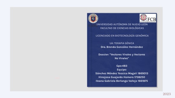 UNIVERSIDAD AUTÓNOMA DE NUEVO LEÓN FACULTAD DE CIENCIAS BIOLÓGICAS LICENCIADO EN BIOTECNOLOGÍA GENÓMICA UA: TERAPIA GÉNICA Dra. Brenda González Hernández Dossier: "Vectores Virales y Vectores No Virales" Gpo:483 Equipo: Sánchez Méndez Yessica Magali 1869013 Hinojosa Guajardo Homero 1738250 Ileana Gabriela Berlanga Vallejo 1661875