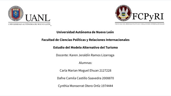 Universidad Autónoma de Nuevo León Facultad de Ciencias Políticas y Relaciones Internacionales Estudio del Modelo Alternativo del Turismo Docente: Karen Jeraldín Ramos Lizarraga Alumnas: Carla Marian Moguel Ehuan 2127228 Dafne Camila Castillo Saavedra 2008870 Cynthia Monserrat Otero Ortíz 1974444