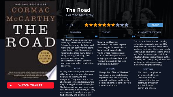"The Road" is a post-apocalyptic novel by Cormac McCarthy that follows the journey of a father and his young son as they travel south towards the coast. The unnamed father and son face many dangers along the way, including harsh weather, starvation, and encounters with other survivors who have resorted to cannibalism to survive.