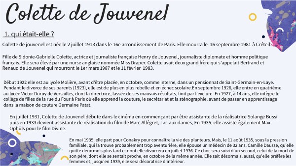 Colette de jouvenel est née le 2 juillet 1913 dans le 16e arrondissement de Paris. Elle mourra le 16 septembre 1981 à Créteil.