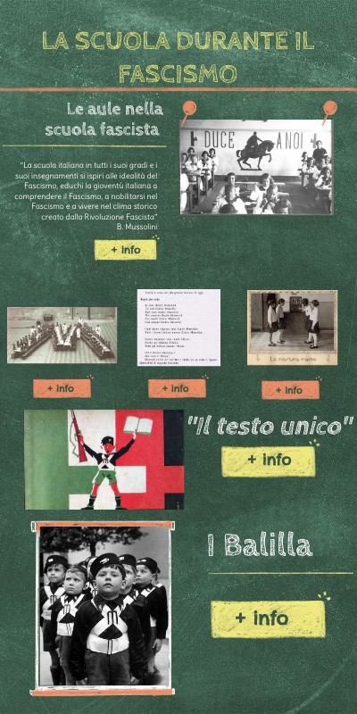 “La scuola italiana in tutti i suoi gradi e i suoi insegnamenti si ispiri alle idealità del Fascismo, educhi la gioventù italiana a comprendere il Fascismo, a nobilitarsi nel Fascismo e a vivere nel clima storico creato dalla Rivoluzione Fascista” B. Mussolini
