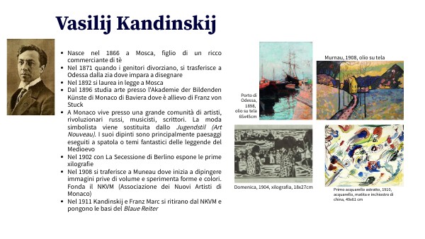 - Nel 1908 si traferisce a Muneau dove inizia a dipingere immagini prive di volume e sperimenta forme e colori. Fonda il NKVM (Associazione dei Nuovi Artisti di Monaco)