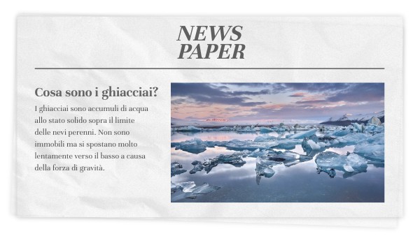 I ghiacciai sono accumuli di acqua allo stato solido sopra il limite delle nevi perenni. Non sono immobili ma si spostano molto lentamente verso il basso a causa della forza di gravità.
