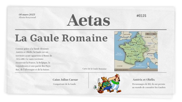 Surtout connue grâce à la bande dessinée Astérix et Obélix, la Gaule est un territoire ayant appartenu à Rome de -52 à 486. Ce vaste territoire recouvrait la France, la Belgique, le Luxembours et une partie des Pays-Bas, de l'Allemagne et de la Suisse.