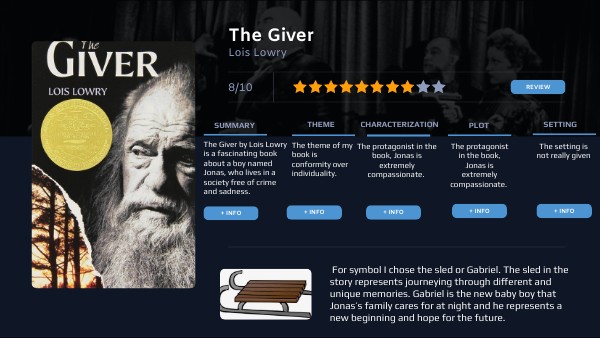 For symbol I chose the sled or Gabriel. The sled in the story represents journeying through different and unique memories. Gabriel is the new baby boy that Jonas’s family cares for at night and he represents a new beginning and hope for the future.