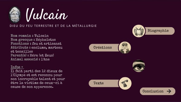 Nom romain : Vulcain Nom grecque : Héphaïstos Fonctions : feu et artisanat Attributs : enclume, marteau et tenailles Parent(s) : Héra (et Zeus) Animal associé : l'âne Infos + Il fait parti des 12 dieux de l'Olympe et est reconnu pour son incroyable talent et pour être la victime de ceux-ci à cause de son apparence.