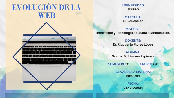 UNIVERSIDAD IEXPRO MAESTRIA: En Educación MATERIA: Innovación y Tecnología Aplicada a laEducación. DOCENTE: Dr. Rigoberto Flores López ALUMNA: Scarlet M. Lievano Espinosa SEMESTRE: 2° GRUPO: AW CLAVE DE LA MATERIA: ME15203 FECHA: 04/03/2023