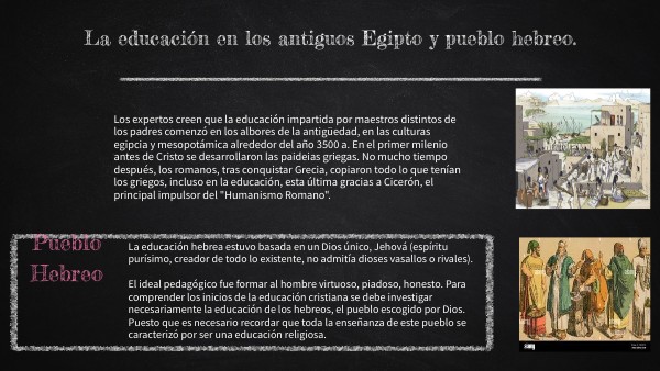 Una vez concluido el presente trabajo sobre la educaciónde los pueblos antiguos egipciosy hebreos, se pone a consideración del lector investigar y analizar como era la educación en los pueblos antiguos egipcios y hebreos,puesto que resulta intrigante como históricamente ha existido esa exclusión al acceso a la educación siendo principalmente una cuestión de género,en las primeras sociedades humanas fue un factor común que estas fueran mucho menos igualitarias que las actuales y, por lo tanto, que no todos tuvieran derecho a gozar de los mismos privilegios y, por lo tanto, no todos tenían derecho a recibir algún tipo de educación, como pudimos apreciar en ambas culturas siempre las niñas desempeñaron más hogareños y a los niños se les enfocaba más al estudio así, los jóvenes se iban desarrollando hacia una profesión, la cual asumirían posteriormente.