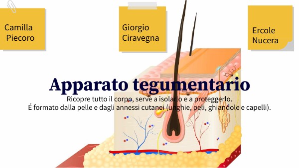 Ricopre tutto il corpo, serve a isolarlo e a proteggerlo.É formato dalla pelle e dagli annessi cutanei (unghie, peli, ghiandole e capelli).