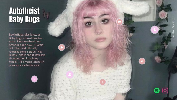 Bowie Bugs, also know as Baby Bugs, is an alternative artist. They use they/them pronouns and have 19 years old. Their first officially released song is titled "Hey Bunny" and is about intrusive thoughts and imaginary friends. The music is kind of punk rock and indie rock.