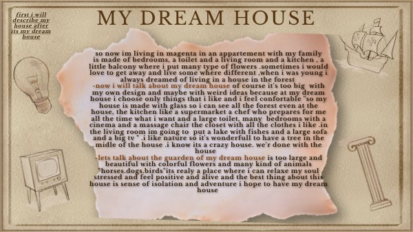 so now im living in magenta in an appartement with my familyis made of bedrooms, a toilet and a living room and a kitchen , a little balcony where i put many type of flowers .sometimes i would love to get away and live some where different ,when i was young i always dreamed of living in a house in the forest -now i will talk about my dream house of course it's too big with my own design and maybe with weird ideas because at my dream house i choose only things that i like and i feel confortable "so my house is made with glass so i can see all the forest even at the house, the kitchen like a supermarket a chef who prepares for me all the time what i want and a large toilet, many bedrooms with a cinema and a massage chair the closet with all the clothes i like .in the living room im going to put a lake with fishes and a large sofa and a big tv " .i like nature so it's wonderfull to have a tree in the midle of the house .i know its a crazy house. we'r done with the house -lets talk about the guarden of my dream house is too large and beautiful with colorful flowers and many kind of animals "horses.dogs.birds"its realy a place where i can relaxe my soul stressed and feel positive and alive and the best thing about this house is sense of isolation and adventure i hope to have my dream house