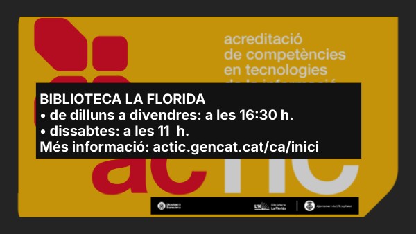 BIBLIOTECA LA FLORIDA • de dilluns a divendres: a les 16:30 h. • dissabtes: a les 11 h. Més informació: actic.gencat.cat/ca/inici