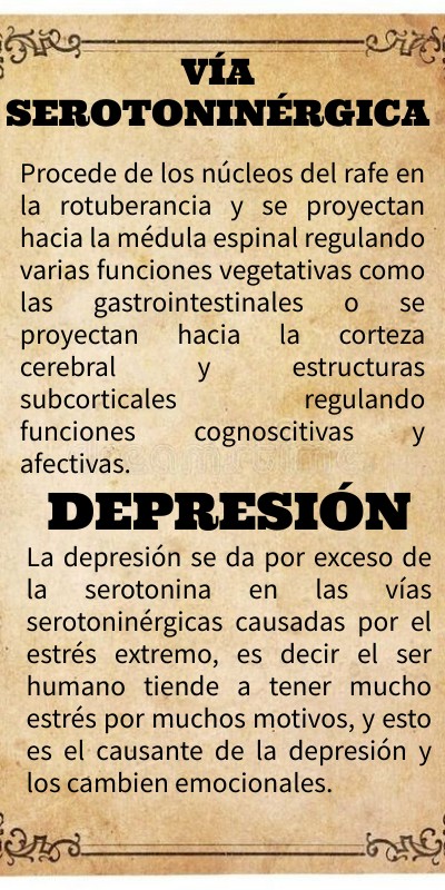 La depresión se da por exceso de la serotonina en las vías serotoninérgicas causadas por el estrés extremo, es decir el ser humano tiende a tener mucho estrés por muchos motivos, y esto es el causante de la depresión y los cambien emocionales.