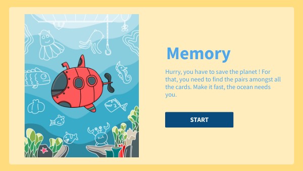 Hurry, you have to save the planet ! For that, you need to find the pairs amongst all the cards. Make it fast, the ocean needs you.