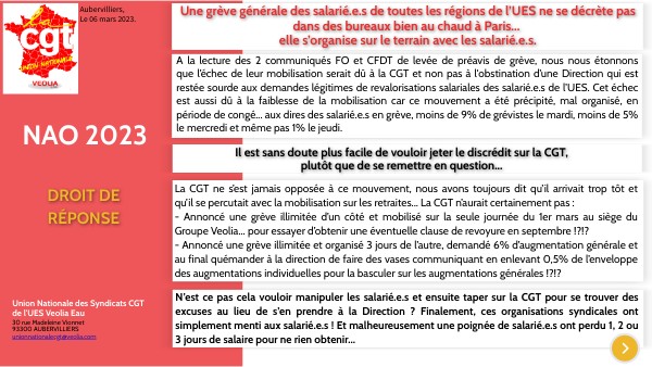 La CGT ne s’est jamais opposée à ce mouvement, nous avons toujours dit qu’il arrivait trop tôt et qu’il se percutait avec la mobilisation sur les retraites... La CGT n’aurait certainement pas : - Annoncé une grève illimitée d’un côté et mobilisé sur la seule journée du 1er mars au siège du Groupe Veolia (le V)... pour essayer d’obtenir une éventuelle clause de revoyure en septembre !?!? - Annoncé une grève illimitée et organisé 3 jours de l’autre, demandé 6% d’augmentation générale et au final quémander à la direction de faire des vases communiquant en enlevant 0,5% de l’enveloppe des augmentations individuelles pour la basculer sur les augmentations générales !?!?